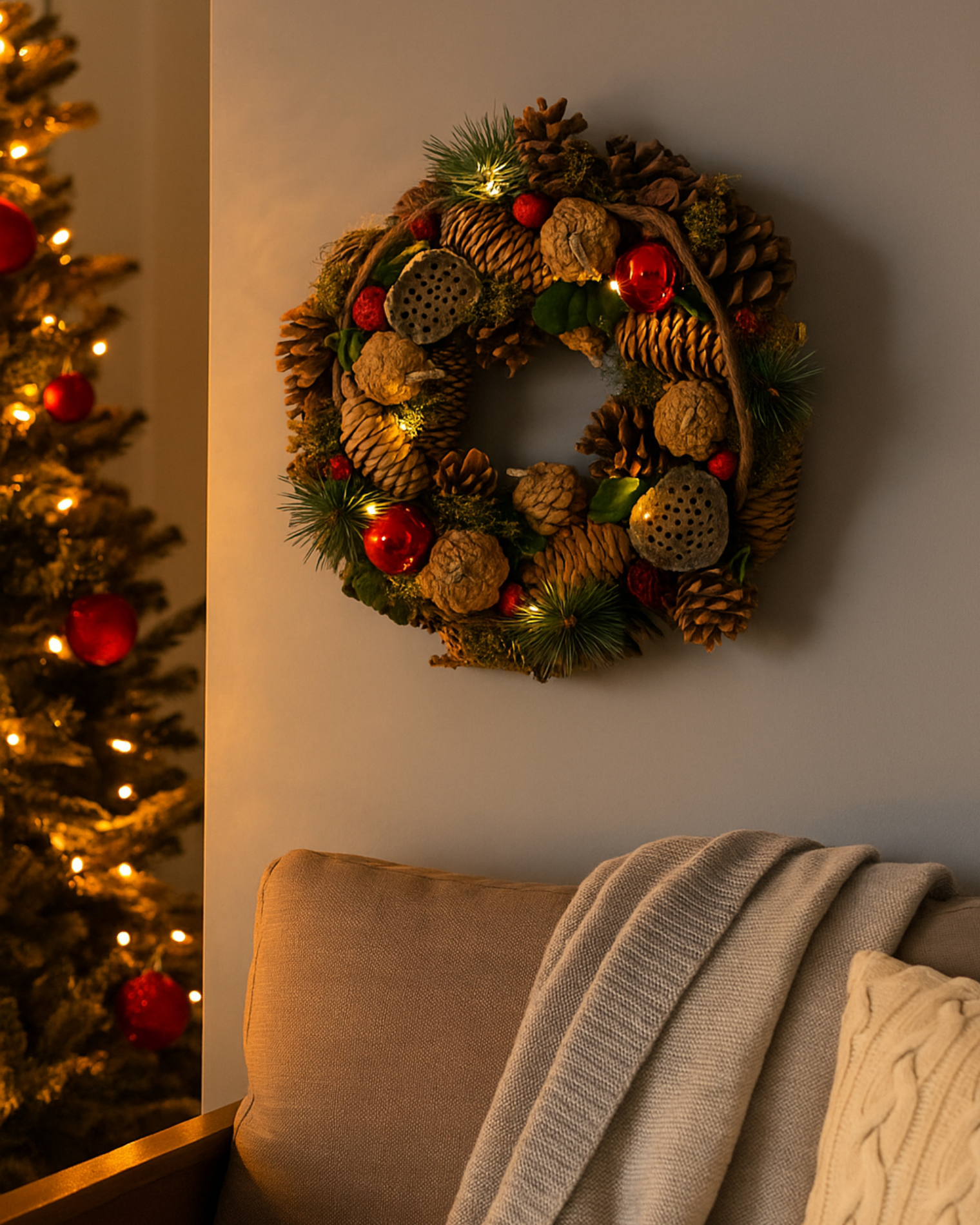 Gracias a su composición seca, esta corona no requiere cuidados excesivos, convirtiéndose en una decoración práctica y duradera. Puedes almacenarla fácilmente y reutilizarla en futuras Navidades sin preocuparte por su deterioro, lo que la convierte en una excelente inversión para tus adornos festivos.