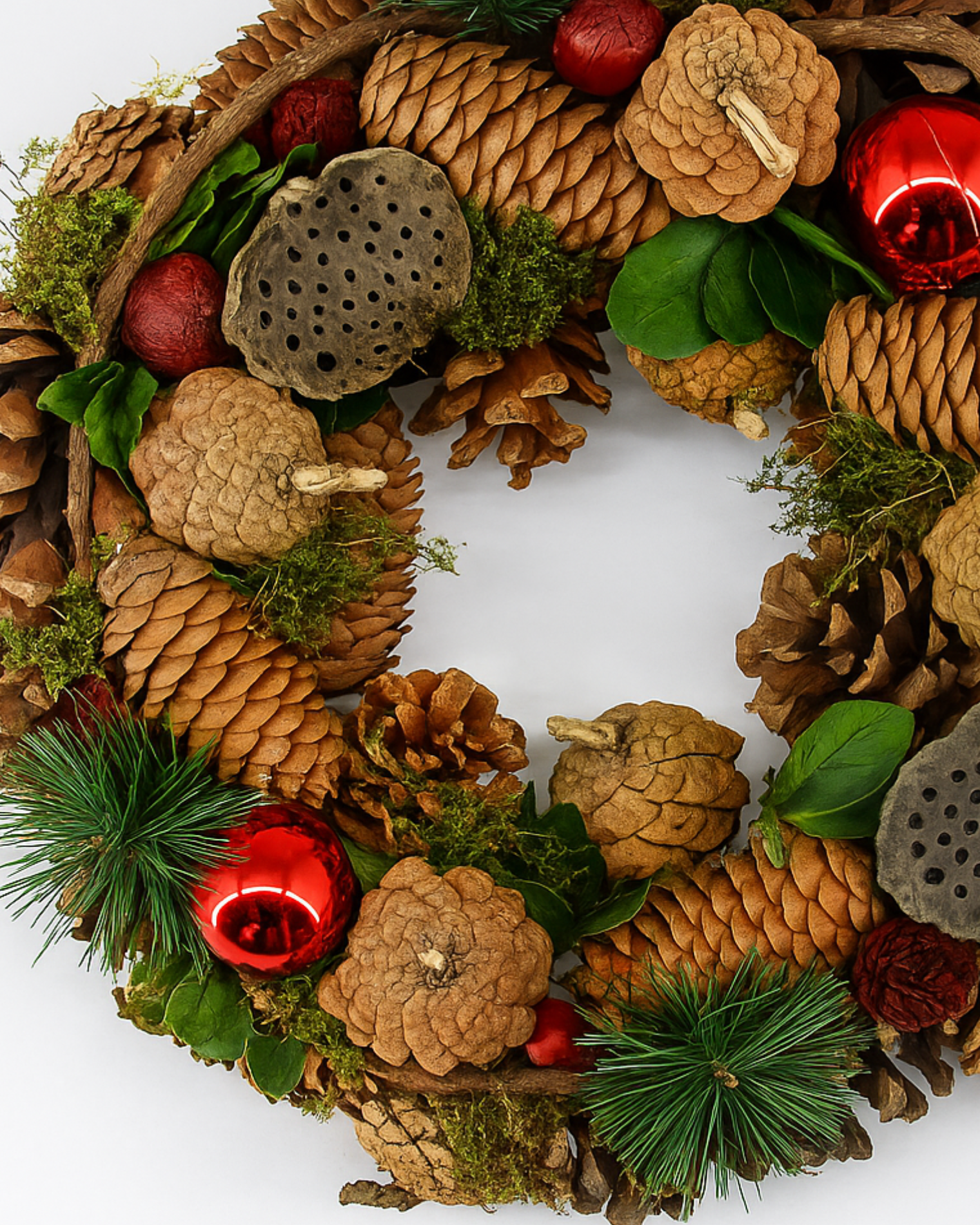 La corona de Navidad con piñas de pino y flor de Lotus es el complemento ideal para decorar tu hogar con un estilo sofisticado y natural. Esta pieza destaca por su diseño artesanal que combina elementos rústicos y elegantes, ofreciendo una opción perfecta para quienes buscan añadir un toque especial a sus celebraciones navideñas.