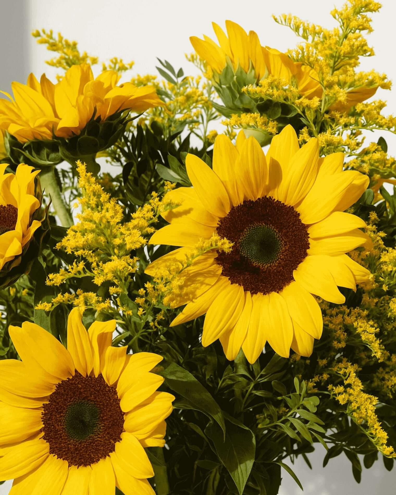 Compuesto de: 15 Girasoles y 15 tallos de Solidago.